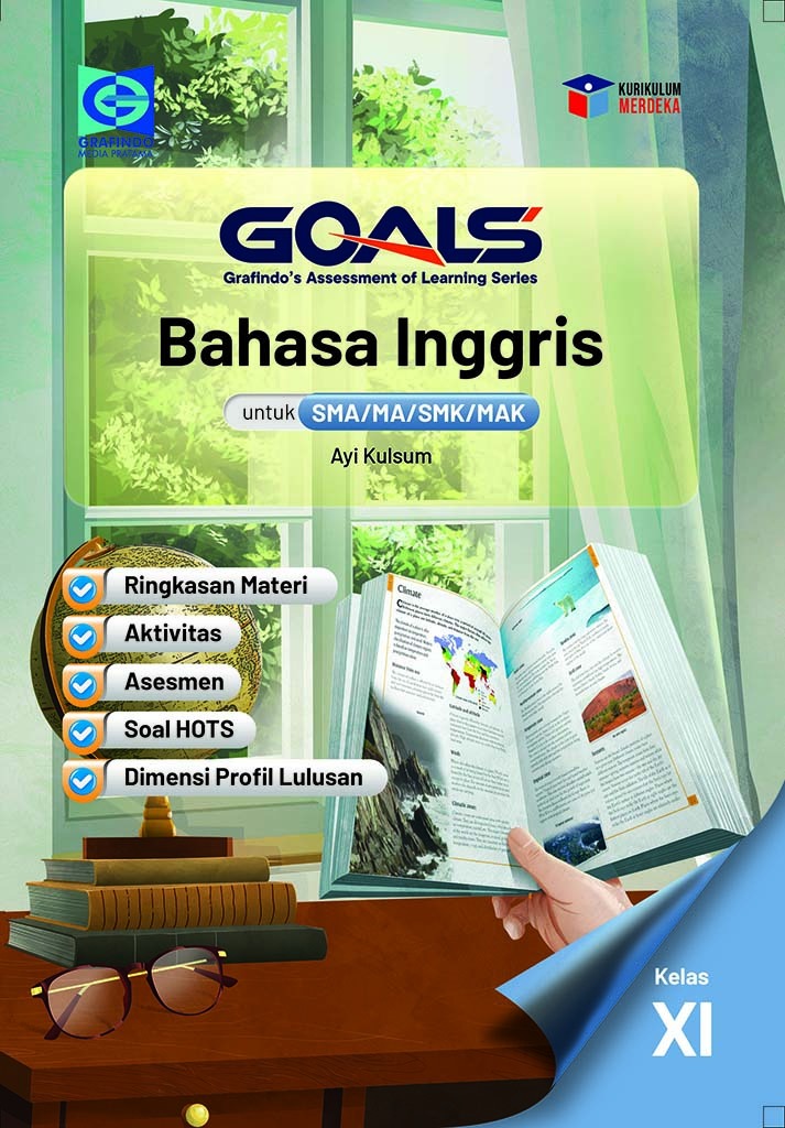 Sinopsis | Buku seri GOALS (Graἀndo’s Assessment of Learning Series) Bahasa Inggris untuk SMA/MA/SMK/MAK Kelas XI disusun untuk menunjang pembelajaran Bahasa Inggris Anda. Buku ini telah disesuaikan dengan Kurikulum Merdeka untuk memenuhi Capaian Pembelajaran. Selain itu, buku ini dapat membantu Anda dalam mempelajari penerapan soal Bahasa Inggris. Bahasa yang digunakan disajikan secara singkat dan padat sehingga memudahkan Anda mengingat kembali materi yang telah dipelajari. |